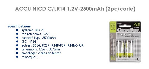 Nom du produit : ACCU 1,2 Volts 2500 mAh NICD LR14 GP Blister de 2
