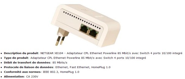 Adaptateur CPL Ethernet 85 Mbp/s avec 4 ports 10/100 NETGEAR XE104 @