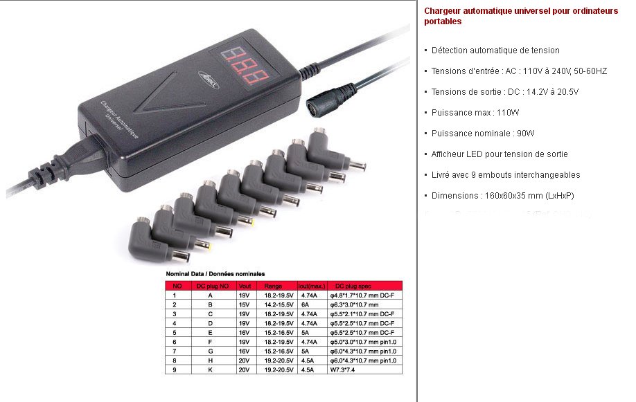 Description du produit : Chargeur ultra slim automatique universel pour ordinateurs portables
