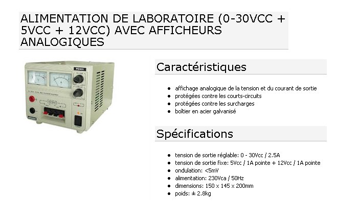 > > > > Alimentation 12 Volts 5 Volts 1 Ampère 0 à 30 Volts 2,5 Ampères PS603