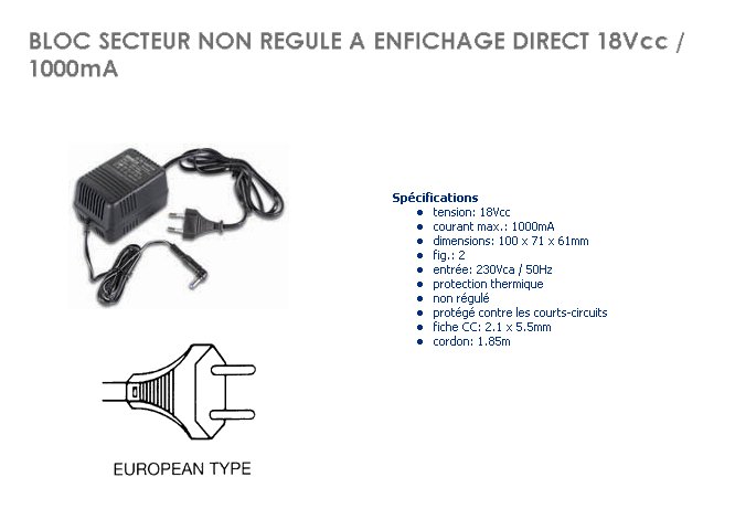 Alimentation 18 Volts CC 1 Ampère PS1810