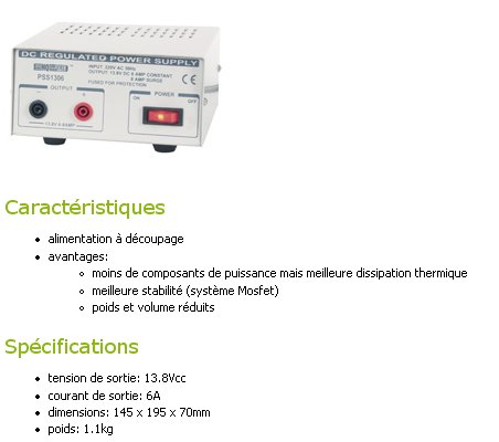 Alimentation fixe 13.8 Volts 6 Ampères dimensions: 145 x 195 x 70mm PS1306