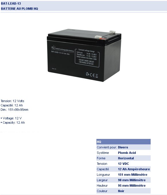 > > > > Batterie plomb étanche 12 Volts 12 Ah 151 x 98 x 97.5 mm 4,03 Kg