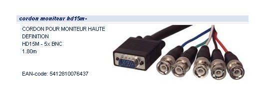 Câble RVB + synchro / SUB-D 15 pts mâle HD