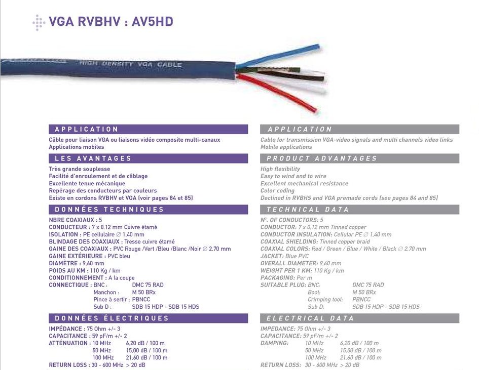 Câble VGA AV5 HD 5 coaxiaux + masse soit 11 conducteurs pour la vidéo