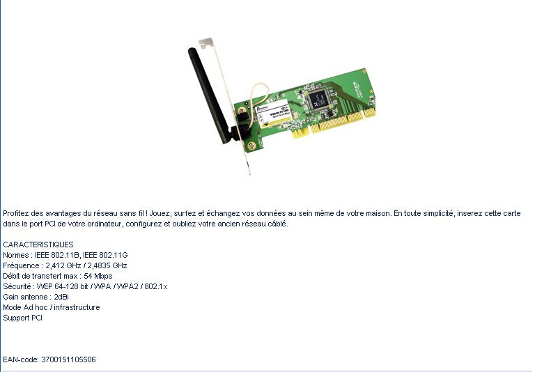 Carte réseau WIFI PCI IEEE 802.11B/G 54 M Gain antenne : 2dBi