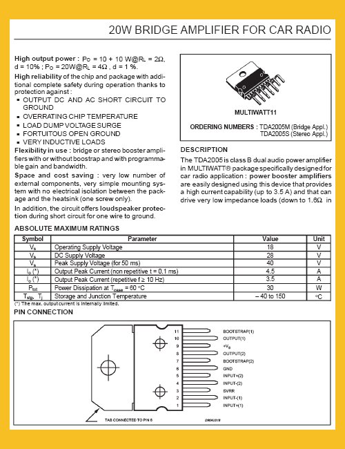 Circuit intégré TDA2005M 20W BRIDGE AMPLIFIER FOR CAR RADIO MULTIWATT