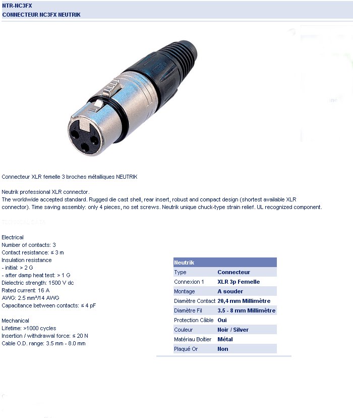 FICHE XLR 3 broches FEMELLE NEUTRIK