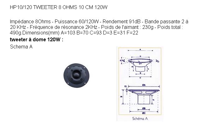 Haut parleur tweeter 120 Watts - 8 Ohms - 10/120 - 10 cm