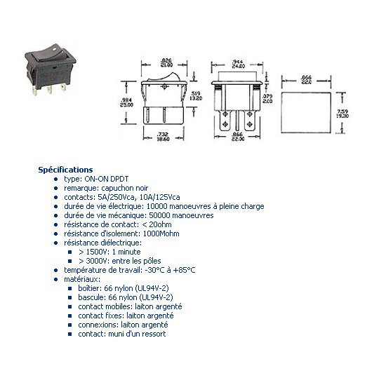 Interrupteur à bascule 2 circuits 2 positions.(21x24) 5 Ampères 250 Volts