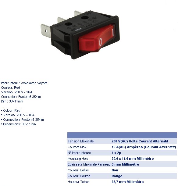 INTERRUPTEUR A BASCULE UNIPOLAIRE M/A LUMINEUX ROUGE 250V 15A