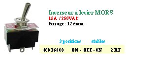 > > > > Inverseur bipolaire à levier 3 positions ON/OFF/ON 10 Ampères 250 Volts 649H/2
