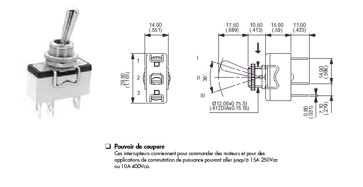 Nom du produit : INVERSEUR UNIPOLAIRE A LEVIER 2 POSITIONS ON/OFF 15A 250V 636H/2