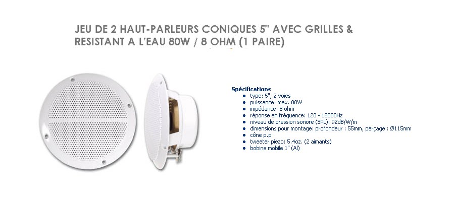 > > > > Jeu de 2 haut parleurs étanches - 8 Ohms - 80 Watts - diamètre 12,7 cm