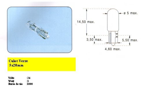 LAMPE 12V 1W CULOT VERRE 5x20mm W2321