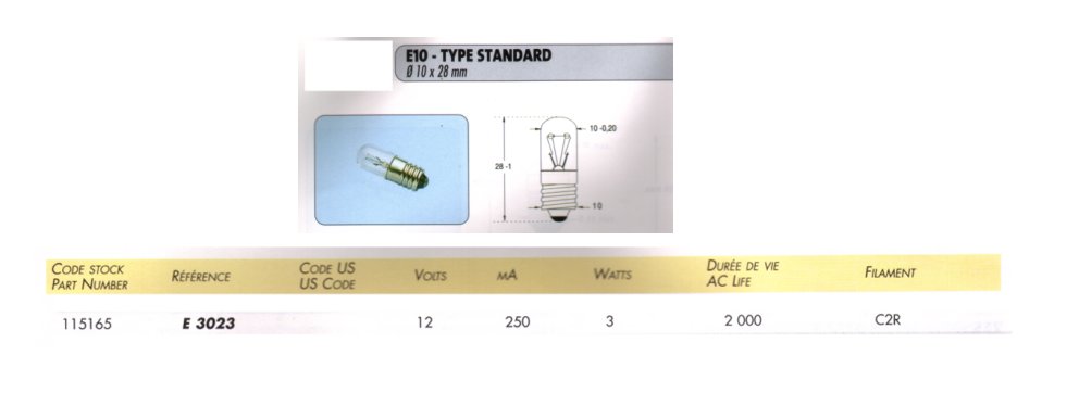 LAMPE 12V 250 mA CYLINDRIQUE CULOT E10 10x28mm E3023