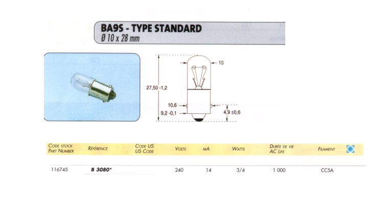 LAMPE 240V 3W CYLINDRIQUE BA9S B3080