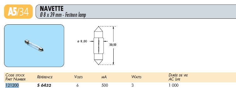 LAMPE 6V 50 mA 3W NAVETTE S6432 8x39 mm
