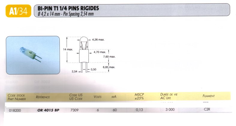 LAMPE 6V 60 mA BI-PIN OR4015BP 4.2x14 mm pas 2.54 mm