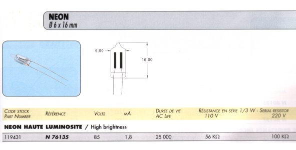 LAMPE 85V 1.8 mA LUCIOLE NEON 6x16 mm N76135