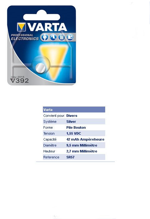> > > > PILE BOUTON ARGENT 1,55V 42mAh V395 VARTA 9,50 x 2,70 mm = S399