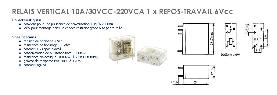 Relais vertical 10 Ampères / 30 VCC-220VCA 1 x repos-travail 6Vcc