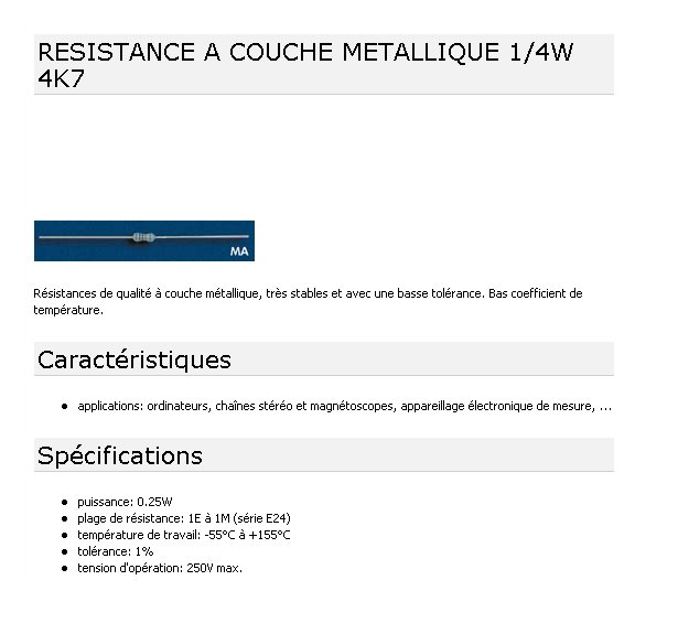 RESISTANCE COUCHE METAL 4.70 Kohms 1% 1/4W