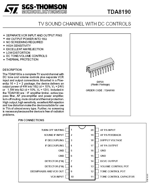 TDA8190 TV SOUND CHANNEL WITH DC CONTROLS DIP20