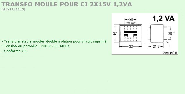 TRANSFORMATEUR 2 x 15V 1.2 VA MOULE