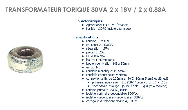 TRANSFORMATEUR TORIQUE 2 x 18V 30VA